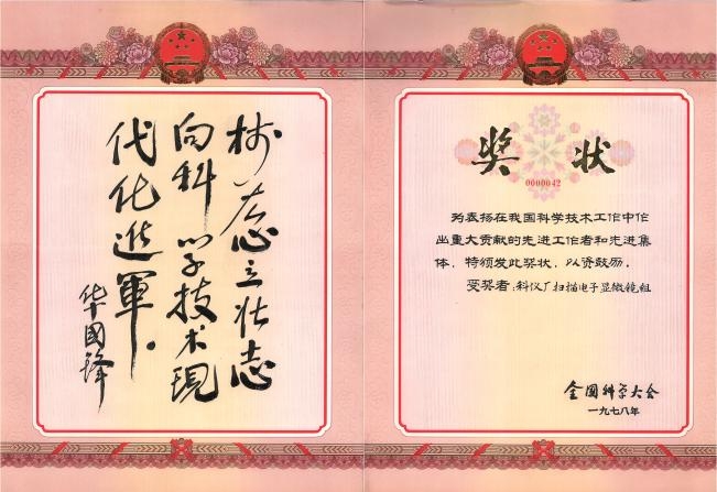 1975年,自主研发出我国首台扫描电子显微镜DX-3型,分辨率达10nm,斩获全国科学大会一等奖与中科院重大科技成果奖一等奖,研发团队获国务院总理亲笔题词荣誉证书,坚实奠定了国产扫描电镜的发展基础。