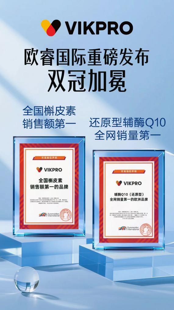 VIKPRO凭借德国精工品质,赢得消费者信赖,也获得了行业认可。VIKPRO槲皮素连续2年获得欧睿国际认证的“全国槲皮素销售额第一的品牌”,其辅酶Q10产品则在2023年及2024年连续两年获得欧睿国际颁发的“还原型辅酶Q10全网销量第一的欧洲品牌”权威认证。不仅如此,品牌旗下磷虾油产品连续5年获得ORIVO品质100%合格认证。